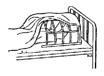 2.保护骨隆突处和支持身体空隙。病人体位安置妥当后,可在身体空隙处垫软枕或海棉垫,酌情在骨隆突处和易受压部位垫橡胶气圈、棉圈、水袋(图6-10、6-11、6-12),使受压部位悬空,必要时可用护架(图6-13)抬高被毯。以避免局部受压。使用气圈时,应充气1/2-2/3满度,套上布套,布套应平整无折,气门向下放于两腿之间,以免压迫局部组织。水肿和肥胖者不宜使用气圈。因局部压力重,用气圈反而影响血液循环,妨碍汗液蒸发而刺激皮肤。可选其它支持物。有条件时,可使用喷气式气垫(图6-14),其结构分气垫与气泵两部分,中间由导管相连。气垫经气泵充气后,支撑病人身体,可分散体重,减轻对局部表面的压迫,防止血循环障碍。使用时打开电源15分钟后,气垫膨胀,气垫表面有许多小孔,能自动喷出微风,使病人身体周围的床铺温度下降,保持皮肤干燥。流动的空气还可阻止化脓菌的繁殖,起到防止和治疗褥疮的作用。另外,也可使用交替充气式床垫、水褥、翻身床等。