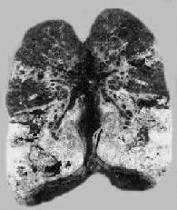 图18-7 肺粟粒性结核病 图中白色点状病灶为粟粒性结核灶 慢性粟粒性肺结核病多见于成年人,这时肺原发综合征业已钙化痊愈,结核杆菌由肺外(骨关节、泌尿生殖道及肾上腺等处)结核病灶较长期、间歇性地进入血流,播散于肺内,形成新旧不等的病变。间隔时间可为数月甚至数年。患者多因结核性脑膜炎死亡。 3)肺外器官结核病:或称肺外结核病,大多是原发性肺结核病经血道播散的后果。在原发综合征期间如有少量结核杆菌经原发灶内的毛细血管侵入血流,则能在肺外某些器官(骨关节,泌尿生殖器官、神经系统、浆膜、皮肤等)内形成个别的结核病灶。这些病灶可自愈或潜伏下来,经过较长时间后,当机体抵抗力下降时乃恶化进展为肺外器官结核病。 (二)继发性肺结核病 继发性肺结核病(secondary pulmonary tuberculosis)是指再次感染结核菌所引起的肺结核病,多见于成年人,故又称成人型肺结核病。肺内的病变常开始于肺尖,称再感染灶。关于再感染灶的形成机制有以下两种学说:①外源性再感染学说,认为继发性肺结核的发病是由外界重新感染所致,与原发性肺结核无任何联系;②内源性再感染学说,认为继发性肺结核病的再感染灶大多是由原发性肺结核病血源性播散时在肺尖部形成的病灶。在机体免疫力下降时,潜伏的病灶可发展为继发性肺结核病。此外,也可是肺内未愈合的原发灶内的结核菌经小支气管蔓延或由肺外器官结核病灶内的结核菌经血道播散至肺的结果。 继发性肺结核病患者对结核杆菌已有一定的免疫力或过敏性,所以继发性肺结核病与原发性肺结核病的病变有以下不同特点:①病变多从肺尖开始,这可能与人体直立位时该处动脉压低、血循环较差,随血流带去的巨噬细胞较少,加之通气不畅,以致局部组织抵抗力较低,细菌易在该处繁殖有关。②由于变态反应,病变发生迅速而且剧烈,易发生干酪样坏死,同时由于免疫反应较强,在坏死灶周围每有以增生为主的病变,形成结核结节。免疫反应不仅能使病变局限化,而且还可抑制细菌的繁殖,防止细菌沿淋巴道和血道播散,因此肺门淋巴结一般无明显病变,由血源播散而引起全身粟粒性结核病者亦极少见。病变在肺内蔓延主要通过受累的支气管播散。③病程较长,随着机体免疫反应和变态反应的消长,临床经过常呈波浪起伏状,时好时坏,病变有时以增生性变化为主,有时则以渗出、坏死变化为主,常为新旧病变交杂。 因此,继发性肺结核病的病变和临床表现都比较复杂。根据其病变特点和临床经过可分为以下几种主要类型: 1.局灶型肺结核 病变多位于肺尖下2~4cm处,右肺较多。病灶可为一个或数个,一般约0.5~1cm大小,多数以增生性病变为主,也可为渗出性病变,中央发生干酪样坏死。如病人免疫力较强,病灶常发生纤维化、钙化而痊愈。临床上病人常无明显自觉症状,多在体检时发现,属无活动性肺结核一类。如病人免疫力降低时,可发展成为浸润型肺结核。 2.浸润型肺结核是临床上最常见的一种类型,属于活动性肺结核。大多是局灶型肺结核发展的结果,少数也可一开始即为浸润型肺结核。病变中央常有较小的干酪样坏死区,周围有广阔的病灶周围炎包绕。镜下,肺泡内充满浆液、单核细胞、淋巴细胞和少数中性粒细胞,病灶中央常发生干酪样坏死。病人常有低热、盗汗、食欲不振、全身无力等中毒症状和咳嗽、咯血等。痰中常可查出结核杆菌。如能早期适当治疗,一般多在半年左右可完全吸收或部分吸收,部分变为增生性病变,最后,可通过纤维化、包裹和钙化而痊愈。 如病人免疫力差或未及时得到适当治疗,病变可继续发展,干酪样坏死灶扩大(浸润进展期)。坏死物质液化经支气管排出后形成急性空洞,洞壁粗糙不整,内壁坏死层中有大量结核杆菌,坏死层外可有薄层结核性肉芽组织包绕。从空洞中不断向外排出含菌的液化坏死物质,可经支气管播散,引起干酪样肺炎(溶解播散)。如靠近肺膜的空洞穿破肺膜,可造成自发性气胸;如果大量液化坏死物质进入胸腔,可发生结核性脓气胸。急性空洞一般较易愈合,如能给以及时和强有力的抗结核治疗,这种空洞可通过洞壁肉芽组织增生而逐渐缩小,最终形成瘢痕而治愈,或通过空洞塌陷,形成索状瘢痕愈合。若急性空洞经久不愈,则可发展为慢性纤维空洞型肺结核。 3.慢性纤维空洞型肺结核为成人慢性肺结核的常见类型,多在浸润型肺结核形成急性空洞的基础上发展而来。病变特点是在肺内有一个或多个厚壁空洞形成。同时在同侧肺组织,有时也可在对侧肺组织,特别是肺下叶可见由支气管播散引起的很多新旧不一、大小不等、病变类型不同的病灶,部位愈下病变愈新鲜。空洞多位于肺上叶,大小不一,呈不规则形,洞壁厚,有时可达1cm以上。洞内常见残存的梁柱状组织,多为有血栓形成并已机化闭塞的血管。空洞附近肺组织有显著纤维组织增生和肺膜增厚(图18-8)。镜下,洞壁分三层:内层为干酪样坏死物质,其中有大量结核杆菌;中层为结核性肉芽组织;外层为增生的纤维组织。由于病情迁延,病变广泛,新旧不等,肺组织遭到严重破坏,可导致肺组织的广泛纤维化,最终演变为硬化型肺结核,使肺体积缩小、变形、变硬、肺膜广泛增厚并与胸壁粘连,可严重影响肺功能。