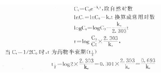 可见按一级动力学消除的药物半衰期与C高低无关,是恒定值。体内药物按瞬时血药浓度(或体内药量)以恒定的百分比消除,单位时间内实际消除的药量随时间递减。消除速率常数(ke)的单位是h-1,它不表示单位时间内消除的实际药量,而是体内药物瞬时消除的百分率。例如ke=0.5h-1不是说每小时消除50%(如果t1/2=1小时则表示每小时消除50%)。按t1/2=0.693/ke计算t1/2=1.39h,即需1.39h后才消除50%。再按 计算,1小时后体内尚存60.7%。绝大多数药物都按一级动力学消除。这些药物在体内经过t时后尚存