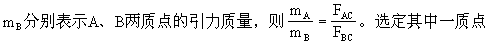 其中m1m2代表两个物体各自产生引力场和受引力场作用的本领,也叫做两物体各自的“引力质量”。r代表两物体间的距离,F是作用于两个物体间的万有引力,G是一个常数,其大小由选择F、r、m1m2的单位而定。由万有引力定律公式知,物体A和B的引力质量m′Am′B之比,定义为它们各自与另一物体的万有引力FAFB之比,即