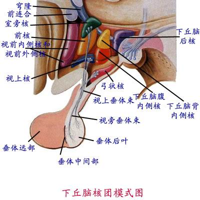 位于背侧丘脑的前下方,主要包括视交叉、漏斗、乳头体、灰结节、垂体等。重要的核团有: