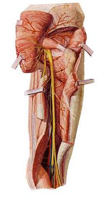 坐骨神经是全身最大的神经。于梨状肌下缘出骨盆,行于臀大肌深面,经坐骨结节与大转子连线的中点,下行至腘窝,分为胫神经和腓总神经。坐骨神经本干布于髋关节和股肌后群。