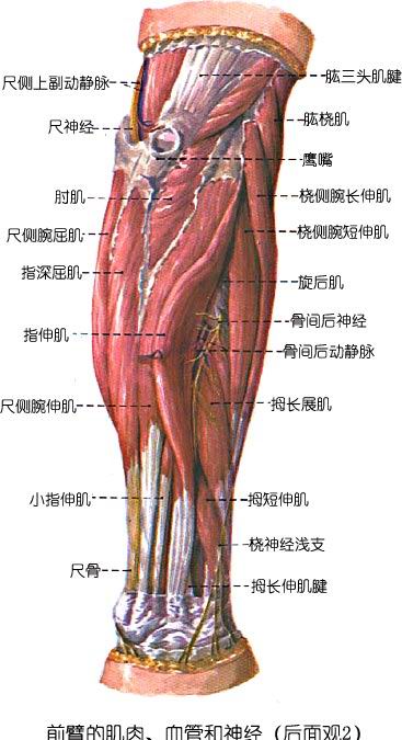 比较复杂,位于桡、尺骨周围,包括前后两群,每群又可分为浅、深两层。前群一般为屈肌(屈肘、屈腕、屈掌、屈指)或旋前肌(前臂旋前),后群一般为伸肌(伸肘、伸腕、伸掌、伸指)或旋后肌(前臂旋后),每块肌的功能多与名称一致。