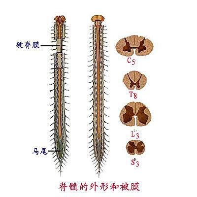 脊髓呈前后略扁的细长圆柱状,长约40~45cm。主要外形可归结为六纵沟、二膨大、一圆锥、一终丝。
