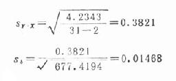式中sy.x为各观察值Y距回归直线(Y)的标准差,是当X的影响被扣除后Y方面的变异指标。可用以下公式计算: