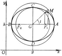 (参数方程,t为与M点对应的同心圆(半径为a, b)的半径与x轴正方向的夹角)