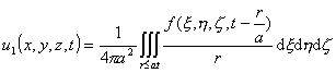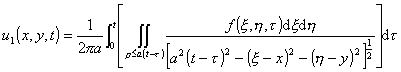 [非齐次方程柯西问题的解]  非齐次波动方程柯西问题的解等于上面齐次方程柯西问题的解添加一项所谓推迟势
