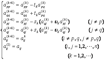 因为在这种旋转变换下,消去了矩阵中位于第p行第q(p¹q)交点上的元素(见本节,五),而矩阵所有元素的平方和保持不变,而且对角线上的元素的平方和增大,因而非对角线元素的平方和随之减小,因此,当旋转次数足够大时,可使非对角线元素的绝对值足够小.对于预先给定的精度e>0,如果aij<e(i¹j),则可认为aij0.于是得到求矩阵A的特征值与特征矢量的具体迭代方法.