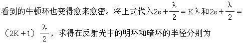 【牛顿环】又称“牛顿圈”。光的一种干涉图样,是一些明暗相间的同心圆环。例如用一个曲率半径很大的凸透镜的凸面和一平面玻璃接触,在日光下或用白光照射时,可以看到接处点为一暗点,其周围为一些明暗相间的彩色圆环;而用单色光照射时,则表现为一些明暗相间的单色圆圈。这些圆圈的距离不等,随离中心点的距离的增加而逐渐变窄。它们是由球面上和平面上反射的光线相互干涉而形成的干涉条纹。在加工光学元件时,广泛采用牛顿环的原理来检查平面或曲面的面型准确度。图4-28为牛顿环的示意图,B为底下的平面玻璃,A为平凸透镜,其与平面玻璃的接触点为O,在O点的四周则是平面玻璃与凸透镜所夹的空气气隙。当平行单色光垂直入射于凸透镜的平表面时。在空气气隙的上下两表面所引起的反射光线形成相干光。如图中所示。光线在气隙上下表面反射(一是在光疏媒质面上反射,一是在光密媒质面上反射)。形成两相干光线,这两光线之间的光程差是