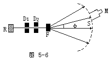【a粒子散射装置】早期的a粒子散射的实验装置如图5-6所示。R为放在铅室中的放射源,D1和D2为限束光栏(目的是为了形成细束),F为金属箔上通过来的位置,S为一荧光屏,M为放大镜。每当a粒子打到荧光屏上时,就有荧光闪烁,通过放大镜观察和计数荧光闪烁的次数,从而测定a粒子束在该处的强弱。S和M可以同步地在以F为圆心的圆弧上移动。在不同的散射角度上测a散射的粒子数是不相同的,利用这些散射粒子的能量和不同角度上的分布,可以研究不同的物质的性质。这种装置是很简单的。近期的a粒子散射实验装置中,多用加速器把a粒子(氦原子核)加速到一定能量并准直为细束,打到要研究的金属箔上,其探测装置,也多用半导体探测器代替荧光屏和放大镜。探测器可以,记录a粒子的数量,通过多道分析器还能定出各种a粒子的能量,测出按能量分布的能谱。a粒子的散射有的散射角大于90°,对于大于90°角的散射,常称之为“背散射”。对于要研究的样品不是薄片而是比较厚的样片,a粒子不能穿过,要研究其表面的性质。多用背散射进行研究。在背散射的分析中,可以用加速器来精确地控制a粒子的能量,使a粒子和靶核的作用在弹性碰撞范围之内,这就可以用经典理论来分析。利用加速器作a粒子源其主要优点是:(1)a粒子的能量单色性好。(2)a粒子的能量可调整到所需要的能量。 (3)可以做高能量的a粒子实验。大大改善了早期a粒子散射实验的精度。近年来,a粒子背散射技术有了更大的发展,特别是在半导体领域中,由于工业生产的发展迫切要求了解半导体表面1μm(微米)内杂质的纵剖面分布、晶体损伤和杂质原子的晶格定位等。背散射技术及沟道效应的应用,正好满足这些要求。此外这种分析方法是定量的,可靠的,对样品非破坏性的分析,尤其是对轻衬底中的重元素杂质的分析,因此这种分析技术得到了很快的发展,成为表面分析的有利工具。