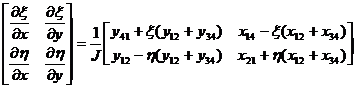 [ Bidirectional distance coordinates ] Starting from a vertex of the quadrilateral, define the distance coordinates on the two adjacent sides ; then define the distance coordinates in the same direction on the opposite edge . Connect , and the variable points with the same distance coordinates into straight line segments to form a local coordinate network. So any point P of the quadrilateral is a node of the coordinate network , and its local coordinates ( ξ , η ) can be taken separately , and the second distance coordinate of the two line segments (ie ). In this way , a one-to- one correspondence is established between quadrilaterals in the Cartesian coordinate system and element squares ( 0 ≤ ξ ≤ 1 , 0 ≤ η ≤ 1 ) in the local coordinate system ( Figure 19.3 ) .![]()