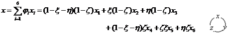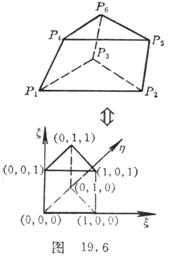 [ Local coordinates ] The area coordinates of the upper and lower base triangles can be used , and the distance coordinates can be used to form local coordinates along the height direction . Let ξ and η take the second and third area coordinates , and ζ take the second distance coordinate , so the triangular prism in the rectangular coordinate system and the unit triangular prism in the local coordinate system ( the upper and lower bases are isosceles right triangles with a side of 1 , The height is 1 , as shown in Figure 19.6 ) to establish a one-to-one correspondence.