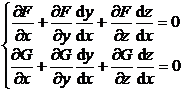 [ Existence Theorem ]   Let the functions F ( x , y , z ) and G ( x , y , z ) be defined in a certain neighborhood R of the point P 0 ( x 0 , y 0 , z 0 ) and satisfy the following conditions :