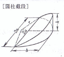 h is the maximum height of the section , b is the arch height of the bottom surface , 2 a is the chord length of the bottom surface , r is the radius of the bottom surface , and