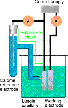 Note the gradual increase of current with voltage around the Eo.  Current (coulombs per second) is a measure of the rate of the electrochemical reaction.  The reaction starts slowly at first but is driven faster as the voltage is increased.  Note also the levelling off of the current to form a plateau.