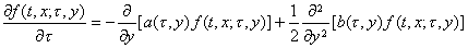 [柯尔莫哥洛夫第二方程]  如果扩散过程的条件分布函F(t,x;τ,y)具有分布密度f(t,x;τ,y),并且下面的各个偏导数