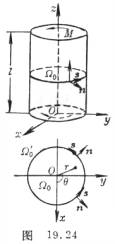 [圆柱的扭转]  圆柱的半径为R,圆柱的中心轴取作z,两端为z=0,z=l,体力不计.首先考虑只在两端截面受相反的力偶矩M(图19.24)而产生的扭转变形.一般可假定只有沿各横截面产生抗扭的剪应力而其余的分量