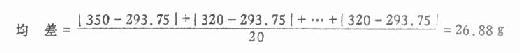 例4.8 试计算4.3中,心重的均差。 由例4.3知X=293.75g,代入式(4.13)得