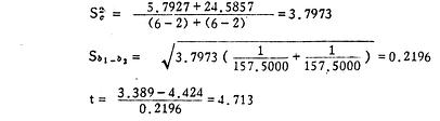 3.查t值表作结论:以ν=6+6-4=8查t值表,得 t0.01,8=2.355,今∣t∣>t0.01,8,故P<0.01。 4.判断结果:按α=0.01水准,拒绝H0,接受H1,故两个回归系数差别显著。说明两条回归直线的斜率不同,两条回归直线中X对Y的影响规律不一致。现b2>b1,说明随着时间的增加,蛋白质在38℃时凝固百分比的增加量比在25℃时高。