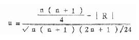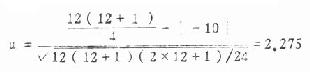 u0.05=1.96u0.01=2.58 (10.5) 式中n为原始资料中数据的对子数,R为正秩号之和或负秩号之和,为计算方便,通常取绝对值较小的秩号之和为r 。 本例,n=12,R=-10,代入得:
