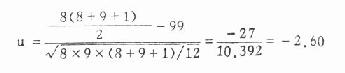 为便于计算和前后符号一致,n1作为较小样本例数,R为较小样本的秩和,n2则为较大样本的例数。 本例n1=8,R=99,n2=9代入公式得: