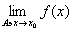[变换的极限] 假定f是把一个拓扑空间X里的一个点集A变进另一个拓扑空间Y的变换.又假定x0是A的一个聚点.如果Y里有一点y0,对y0的任何一个邻域V,x0有一个邻域G,使